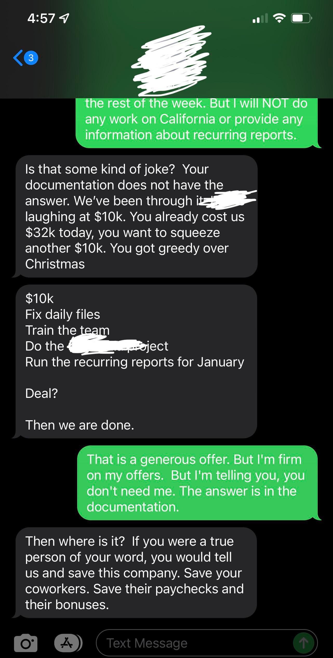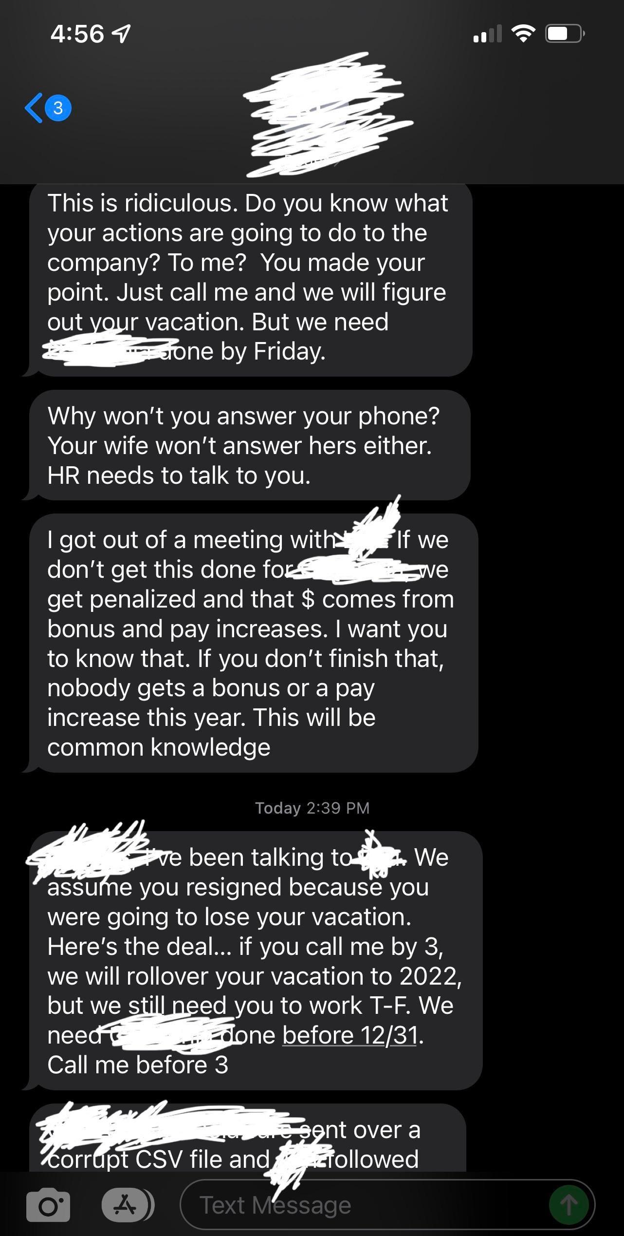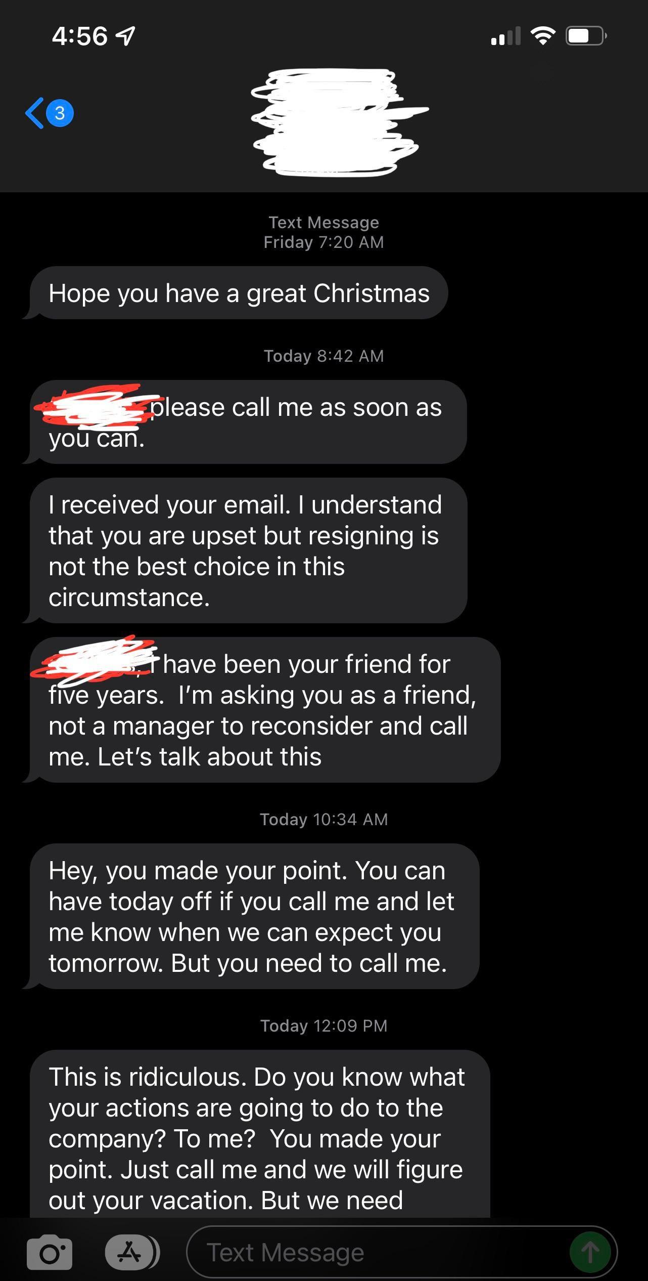 And then the update from Monday, December 27th, 2021. At this point the manager has received the resignation email and knows he is in deep shit: