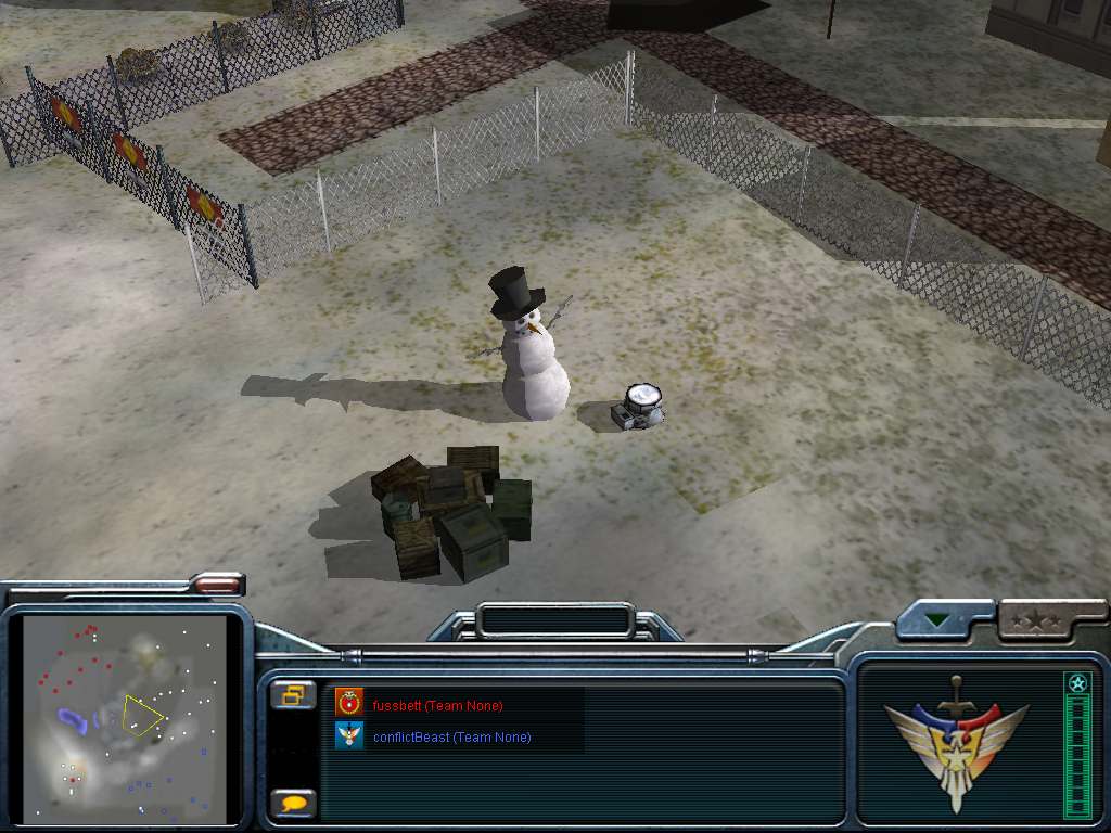 My secret weapon: The Confusion Snowman. The thing beside Frosty is a searchlight. I discovered that in a daytime map, a searchlight just sits there doing no searching nor lighting.